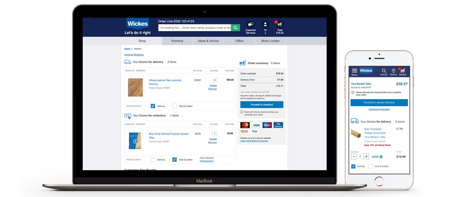 The scope of the project was to update and improve the user experience and the design on the basket page of the Wickes website. No extra functionality could be added to the experience. The goal was to increase conversions by decreasing abandoned baskets and to update the design bring in line with current new UI components. One of the main observations was that the differentiation between click and collect and delivery wasn't clear enough and we wanted the user to be able to switch between the two easily